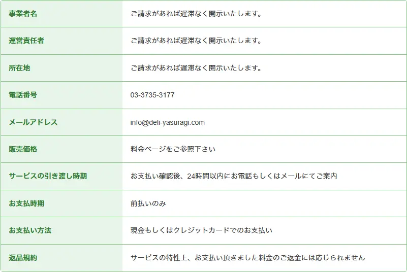 品川デリヘル | 品川やすらぎ | 特定商取引法に基づく表示